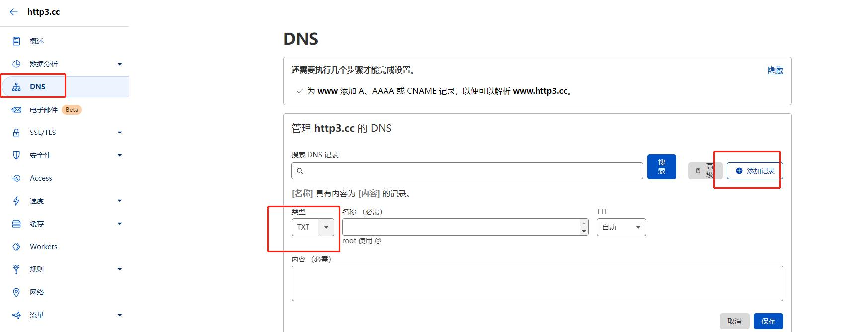 - 将domain和txt_value记录。然后去cloudflare,DNS解析那里,新建一个TXT类型的解析。